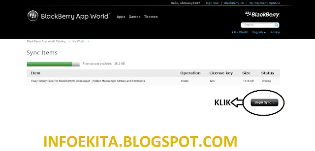 5. Setelah anda instal pluggin Appworld nya, maka tampilannya seperti di bawah ini, kalau belum bisa coba anda putuskan dulu blackberry nya kemudian anda sambungkan kembali, kalau belum bisa restart komputer anda, hingga muncul tulisan Begin Sync sebagai tanda blackberry anda telah terhubung dan aplikasi nya siap untuk di instal, Klik Begin Sync